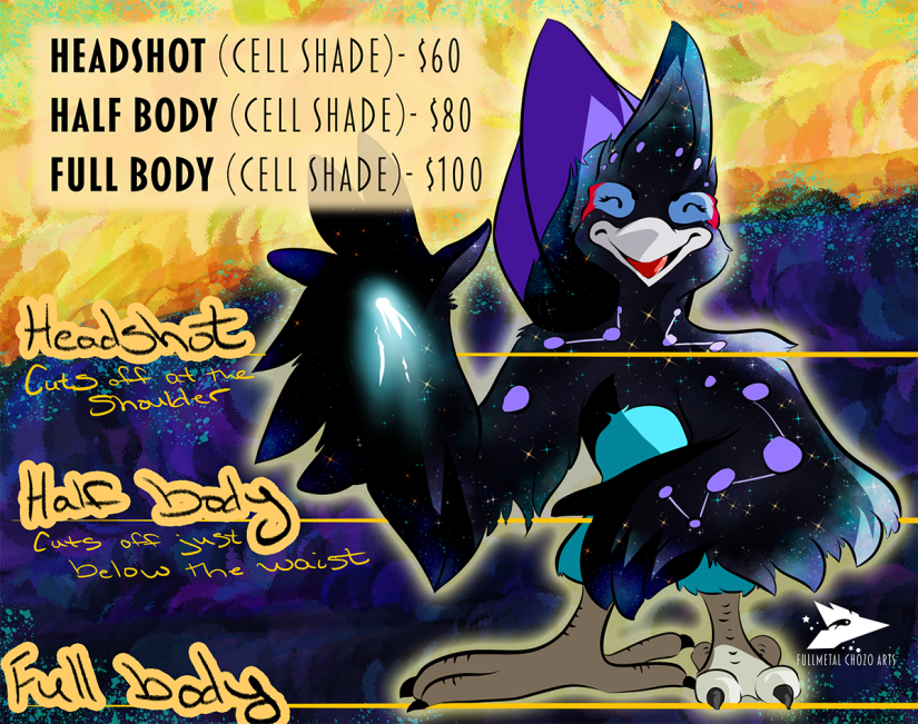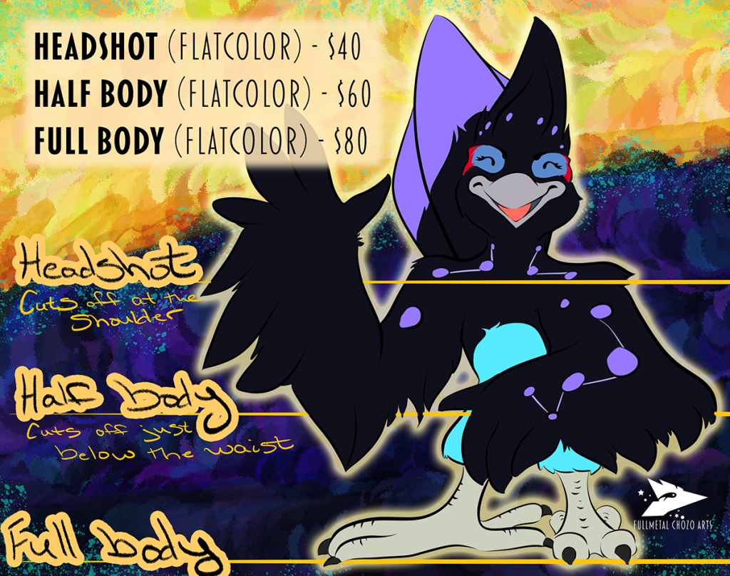 Prices include a simple background (usually an abstract design like in the above price list) and single character. There is an additional charge for extra characters. You can commission this work over on my Ko-Fi page by following this link!